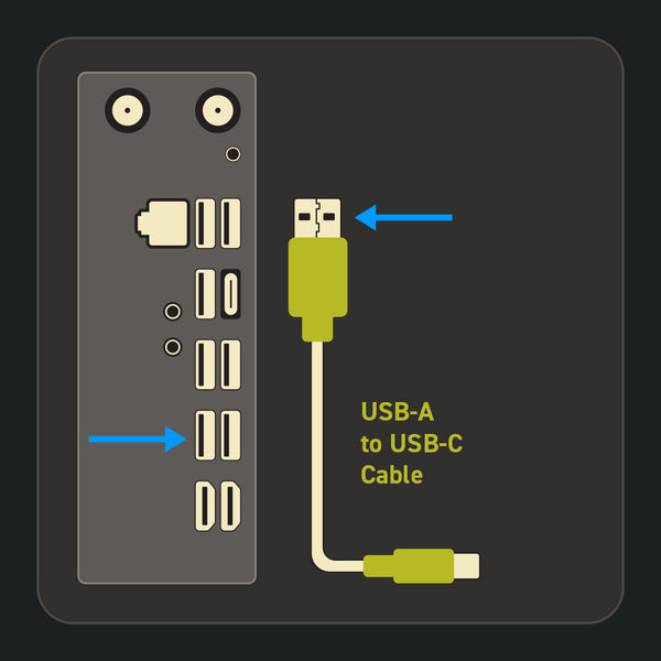 The board requires a wired connection to a Rear I/O port with a USB-C to A cable. Connections to a case USB port or a USB hub are incompatible. All new Battle Beaver x Marius controllers are bundled with a generic 10ft USB-A to USB-C for use.