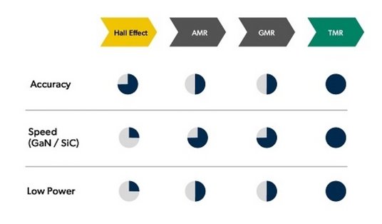 TMR sensors are faster, generate less noise (i.e jitter), use less power, and most importantly provide superior 0-20% dead zone performance when compared to Hall Effect sensors.