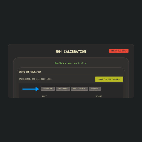 Next, return to main Settings page of the Setup software and reconnect your controller. In STICK CONFIGURATION, click ADVANCED to activate the fine tuning options. Move your thumbstick around the areas you noted as undershooting.