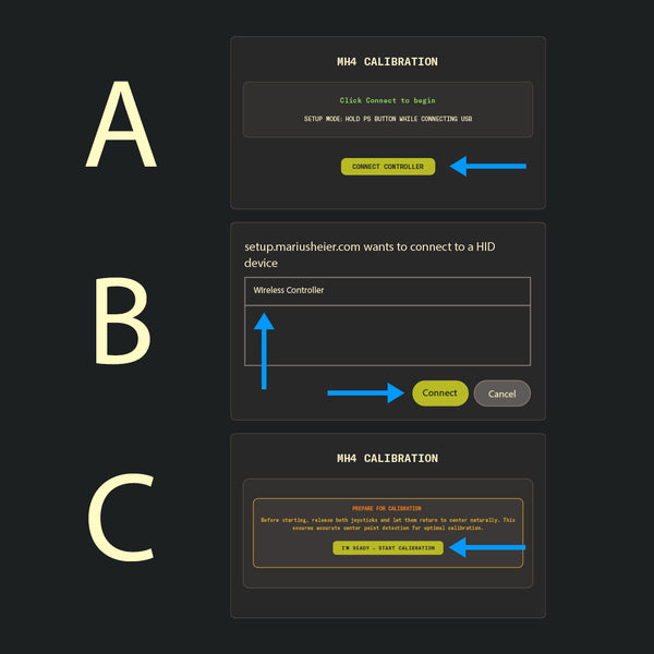 Click the CONNECT CONTROLLER (A) button. This will pop up a browser window. Select your controller from the list, then click Connect (B).