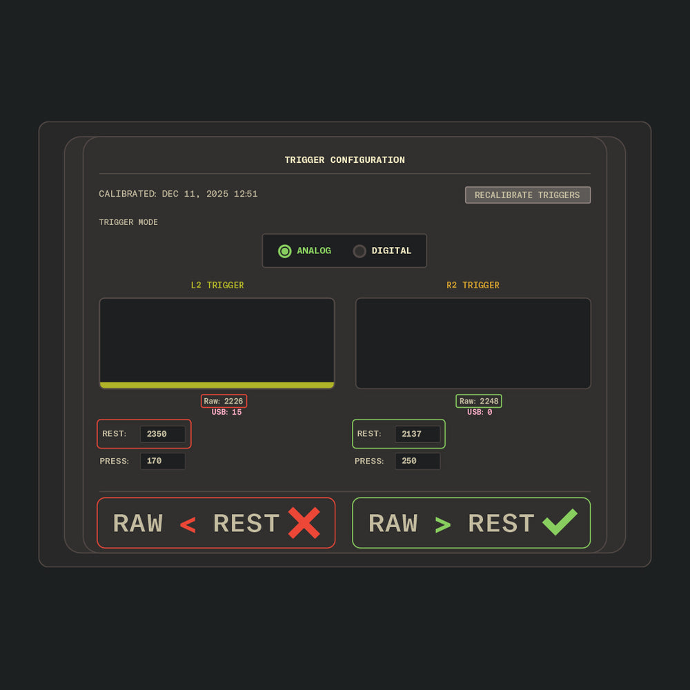 Mode – applies to trigger typesAnalogRest – numbers will vary100–150 below RawPressHigh enough to max out easily,