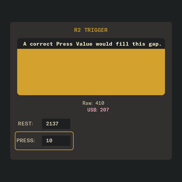 Too high of a PRESS value can cause the triggers to max out too early. This isn’t necessarily a bad thing in most games, but it’ll have a minor impact on any games requiring partial, gradual, or precise trigger presses. Experiment until it feels right to you.