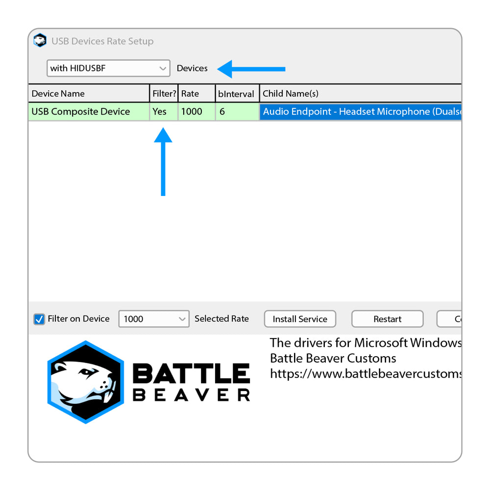 For a final verification, click the "Devices" drop-down at the top-left and select "with HIDUSBF."