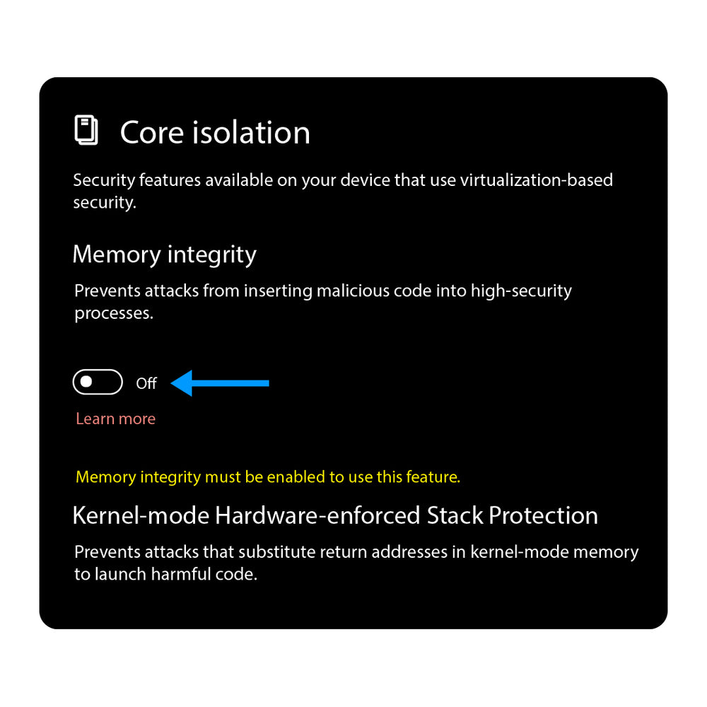 Windows 11 users with the current version of the program will need to make sure the "Memory Integrity" setting is set to "Off" in the security settings. To access this option, search for "Core isolation" or find it under the Windows Security section. The first option in the window is "Memory Integrity."
