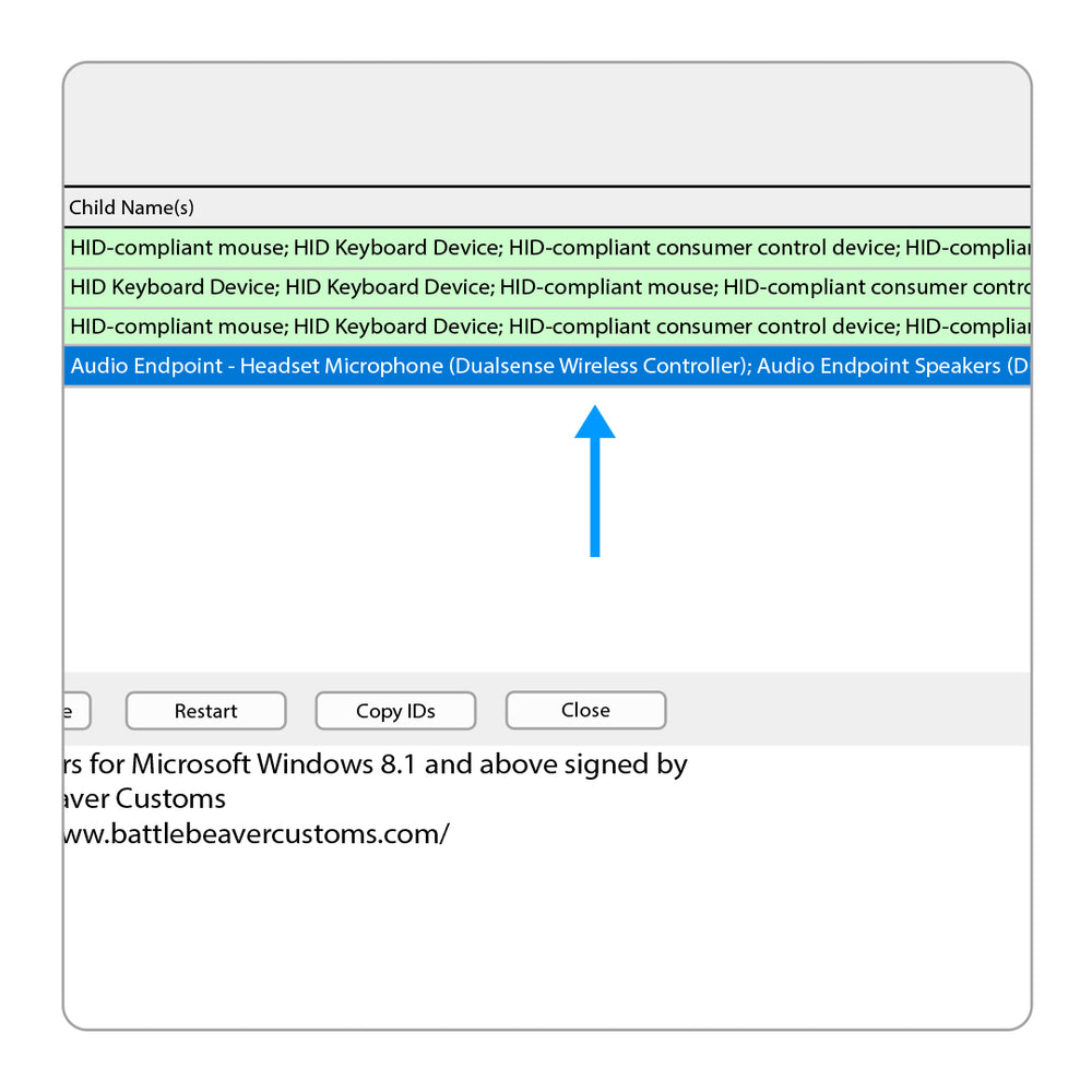 Look for your controller in the list of devices. Unfortunately, the "Device Name" column may not be helpful, especially if you have a lot of USB devices. Look at the "Child Name(s)" column instead. The names in this column can be a little tricky, but a few words in, you should see "Wireless Controller" included on one of the lines. That's your controller.
